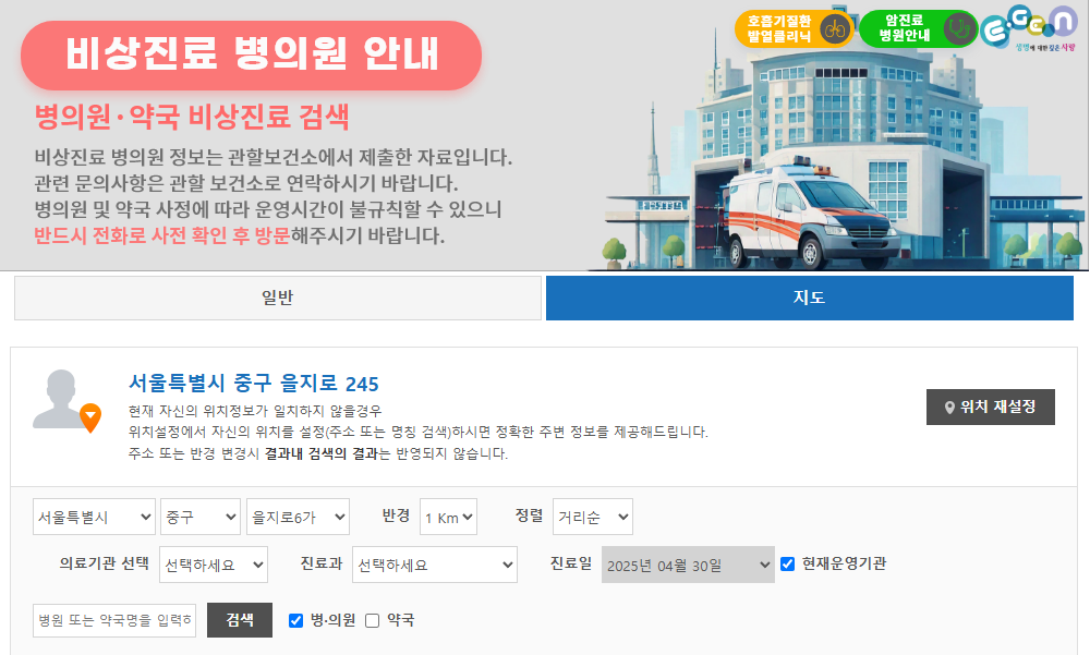 - 병원, 약국, 응급실, 치과 등 의료기관 전체 검색 가능